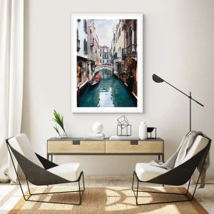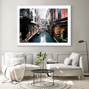 Plakat i hvid ramme - Venetiansk landskab med gondol og bro - 50x40 cm