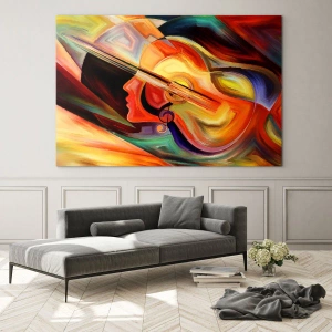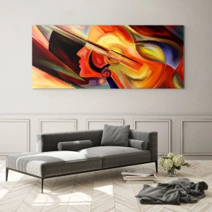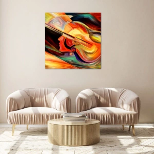 Tryk på glas sikrer detaljer i høj kvalitet, takket være hvilket maleriet bevarer farvernes intensitet og præcisionen i håndværket i mange år. Portrættets abstrakte form kombineret med en guitar og musikalske noter skaber en unik harmoni, der kan inspirere kreativiteten.