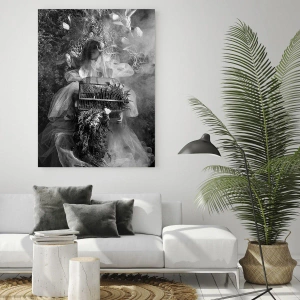 Vægkunst - Mor alene - Natur - Kvinde i tylkjole med bur og plantekrone i sort-hvid
