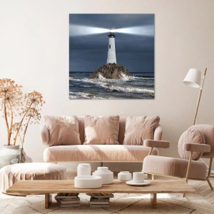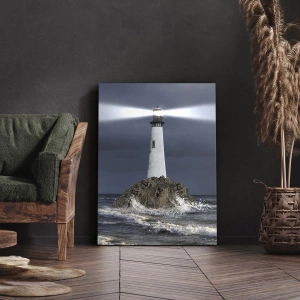 Lærredstryk - Billede på lærred - Et fyrtårn på en klippe omgivet af et stormfuldt hav - 70x50cm - Her...her...her! - Moderne vægdekoration til stue og soveværelse ARTTOR