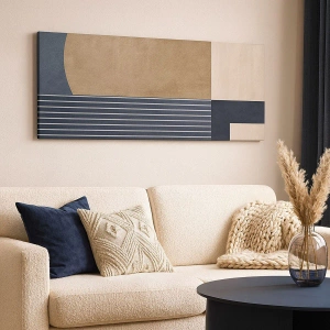 - Dette lærredstryk på 70x50 cm viser geometriske former i beige og marineblå nuancer med fine linjer. Det er perfekt til moderne interiører og bringer harmoni og elegance.