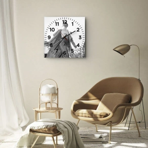Væguret "Kommer du med mig?" er til dem, der værdsætter mode, moderne stil og en karakteristisk visuel form. Den sort-hvide grafik, der skildrer en stilfuld kvinde i dynamisk bevægelse, skaber en stærk dekorativ accent, der tiltrækker opmærksomhed og opbygger rummets karakter.