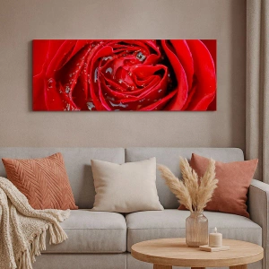 Lærredstryk - Billede på lærred - Nærbillede af en rød rose med vanddråber på kronbladene - 70x50cm - I dråber af dug - Moderne vægdekoration til stue og soveværelse ARTTOR