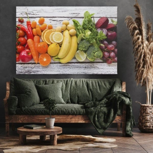 Lærredstryk - Billede på lærred - Farverige frugter og grøntsager på en træbaggrund - 70x50cm - Er det ikke nok? - Moderne vægdekoration til stue og soveværelse ARTTOR