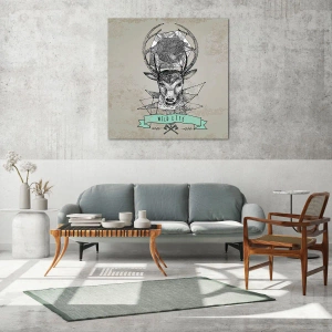 Billede på glas - Geometrisk tegning af en hjort med indskriften "Wild Life" - 70x50cm - Synet af sankt Hubertus - Moderne vægdekoration til stue og soveværelse ARTTOR