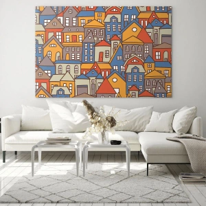 Farverige huse i grafisk stil er også et fremragende valg for dem, der ønsker at tilføje hygge og udtryksfuldhed til deres interiør. Dette motiv udstråler positiv energi og tiltrækker opmærksomhed med sin originalitet.