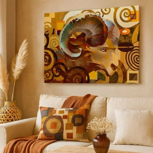 - Et lærredstryk, der forestiller en symbolsk vædder i en abstrakt komposition fuld af spiraler og varme farver. En unik dekoration, der bringer energi og karakter til ethvert interiør.