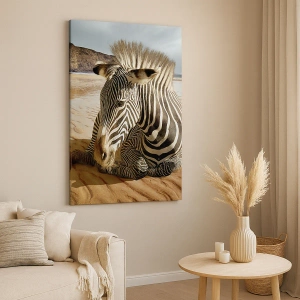 Lærredstryk - Billede på lærred - En zebra hviler på en sandstrand med klipper i baggrunden. - 70x50cm - Vi passer sammen - Moderne vægdekoration til stue og soveværelse ARTTOR