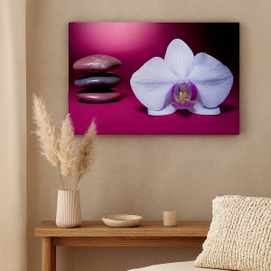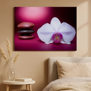 Lærredstryk - Billede på lærred - Hvid orkidé og sten på en lyserød baggrund - 70x50cm - En undersøgelse af friskhed i lilla - Moderne vægdekoration til stue og soveværelse ARTTOR