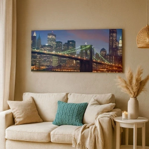 New York Bridge om natten med oplyste bygninger er et maleri, der perfekt komplementerer elegante interiører og introducerer en atmosfære af storbystil og modernitet. Det er det perfekte valg for dem, der værdsætter bylandskaber og tidløst design.