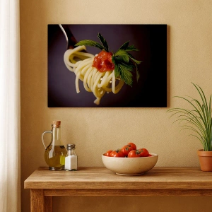 "Tasty Bite" er et unikt lærredstryk, der forestiller elegant serveret spaghetti på en gaffel med tomatsauce og persille. Det passer perfekt ind i køkkener og spisestuer og tilføjer et appetitligt og stilfuldt kulinarisk præg til interiører.