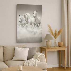 Maleriet "Tre hvide heste galoperer gennem vand" er en unik vægdekoration, der indfanger naturens dynamik og skønhed. Det forestiller tre hvide heste, der galoperer gennem vand, hvilket skaber en harmonisk komposition fuld af bevægelse og energi. Delikate vandstænk og en lys baggrund understreger deres majestætiske silhuet, hvilket giver maleriet subtilitet og elegance.