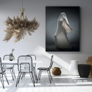 Lærredskunst "Figur i hvidt stof på en mørk baggrund" er et værk, der kombinerer elegance, subtilitet og kunstnerisk udtryk. Det centrale motiv er en delikat figur, pakket ind i et let, halvtransparent stof, der skaber en æterisk og mystisk effekt. Kontrasten mellem stoffets lysstyrke og den mørke baggrund understreger minimalismens skønhed og fokus på detaljer.