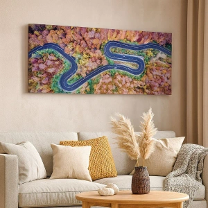 - Et maleri, der forestiller en snoet vej gennem en efterårsskov, set fra et fugleperspektiv. Denne dekoration indfanger naturens skønhed og rummets harmoni.
