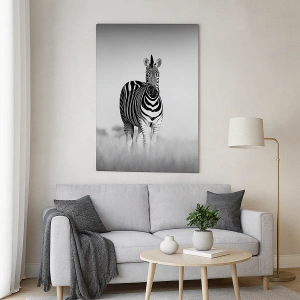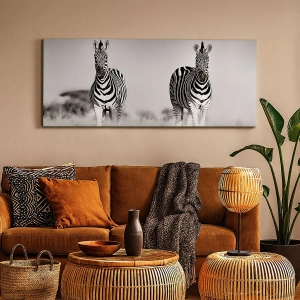 - Lærredsbilledet "And Yet the World Is Black and White" forestiller to zebraer, der står på savannen, i en monokromatisk stil. Det er den perfekte dekoration til moderne og minimalistiske interiører.