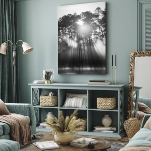 • Dette sort-hvide fotografi af en skov i morgentåge skaber et diskret og stemningsfuldt dekorativt motiv. Perfekt til minimalistiske interiører.