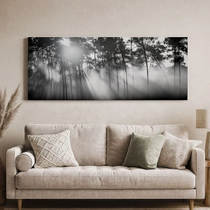 Lærredstryk - Billede på lærred - Sort og hvid skov i morgentågen - 70x50cm - Ustoppelig sol - Moderne vægdekoration til stue og soveværelse ARTTOR