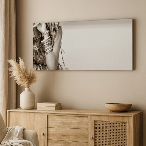 - Et monokromatisk portræt af en kvinde i bohemestil, udsmykket med smykker og diskrete detaljer. Et perfekt valg til stilfulde og sofistikerede interiører.