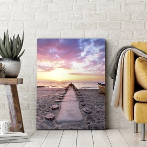 Vægkunst - Et øjeblik med dyb oplevelse - Strand ved solopgang med en båd og mole