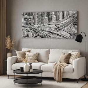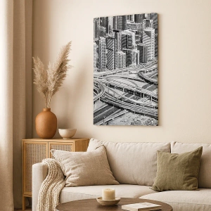 Lærredstryket 70x50 cm, fremstillet med omhyggelig opmærksomhed på detaljer, giver dig mulighed for fuldt ud at værdsætte bylandskabets kompleksitet. Billedets detaljer fremhæver de dynamiske vejlinjer og skyskrabernes imponerende arkitektur, hvilket giver rummet dybde og karakter.