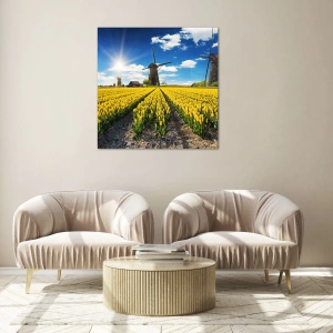 Et felt af gule tulipaner med vindmøller i baggrunden er et unikt stykke, der fanger øjet og skaber en varm atmosfære i ethvert rum. Det er også en perfekt gave til naturelskere og landskaber inspireret af hollandske udsigter.