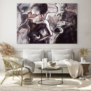 - Maleriet skildrer en dynamisk dansescene med en saxofonist i en kunstnerisk, skitseret stil. Denne udtryksfulde komposition komplementerer perfekt interiører, der fyldes med energi og passion.