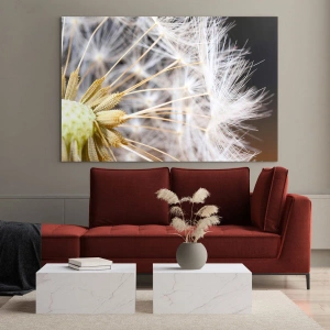- Maleriet forestiller et nærbillede af en delikat mælkebøtte med svævende frø. Den minimalistiske komposition bringer harmoni og ro, perfekt til naturlige interiører.