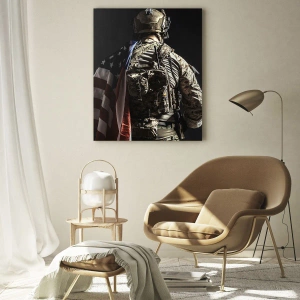 Vælg maleriet "Soldat med et amerikansk flag" på en "mørk baggrund" for at tilføje en unik stil, inspiration og et stærkt budskab til dit interiør. Lad dette maleri blive et symbol på ære, offer og patriotisme.