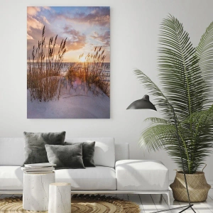 - Dette fotografi forestiller en gylden solnedgang over havet, synlig gennem græsset, der vokser på kystklitterne. Billedet udstråler ro og naturlig skønhed, perfekt til lyse interiører.