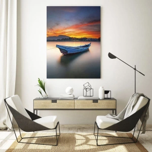 Vægbillede - Godnat kommer - Træbåd på en sø ved solnedgang