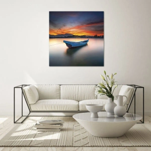 Billede på glas - Træbåd på søen ved solnedgang - 70x50cm - En god nat er på vej - Moderne vægdekoration til stue og soveværelse ARTTOR
