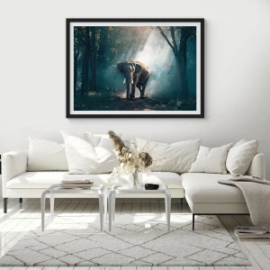 - En plakat, der forestiller en elefant i en tæt skov oplyst af sollys, hvilket skaber en eksotisk atmosfære og harmoni i interiøret.