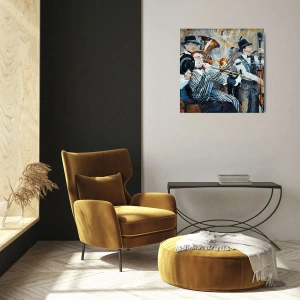 Dette unikke vægur skildrer den dynamiske scene i et jazzband på en kunstnerisk måde. Maleriske teksturer og varme farver formidler en retro-atmosfære og skaber en dekoration, der bringer harmoni og en unik musikalsk atmosfære til interiøret.