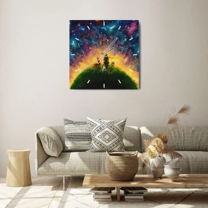 Vægur, Uret - Et maleri, der forestiller to figurer mod en farverig himmel - 30x30cm - Kærlighed og venskab - hele verden - Moderne vægdekoration til stue, køkken og soveværelse ARTTOR
