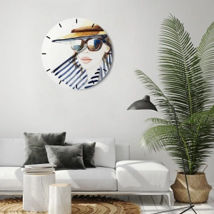 Vægur med en diameter på 30 cm med et kunstnerisk motiv af en kvinde med hat og solbriller. Perfekt til interiører med en moderne og elegant karakter.