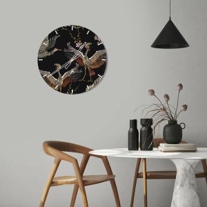 Vægur, Uret - Illustrative fugle i flugt mod en baggrund af blomstergrene og sort - 30x30cm - Eventyrlig fugl - Moderne vægdekoration til stue, køkken og soveværelse ARTTOR