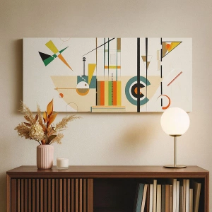 Kompositionen består af forskellige geometriske elementer, såsom cirkler, linjer og trekanter, som er blevet kombineret til en sammenhængende helhed. Farver som gule, grønne, orange og blå farver giver maleriet en glædelig og positiv karakter, samtidig med at de understreger dets unikke design. Dette er et maleri, der bringer energi og kreativitet til interiøret.