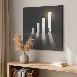 Lærredsbilledet "Succes – indtryk" er en moderne dekoration, der subtilt præsenterer ideen om fremskridt og inspiration. Det centrale element er lysende passager i form af voksende rektangler, der strækker sig mod en mørk baggrund. Denne kombination af lys og skygge skaber en minimalistisk, men dybsindig komposition.