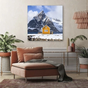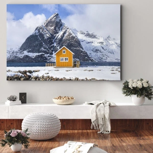 "Skandinaviske Ferier" er et 70x50 cm lærredstryk i vandret format, der indfanger skønheden i et vinterlandskab. Det forestiller et gult hus mod baggrund af sneklædte bjerge og et roligt hav, hvilket skaber en unik komposition fuld af kontraster og harmoni.