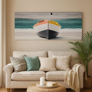 - Dette maleri forestiller en båd på en rolig strand med et turkisblåt hav i baggrunden. En perfekt dekoration, der bringer harmoni og udtryksfuldhed til ethvert interiør.
