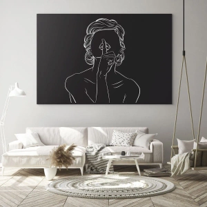 - Et minimalistisk stregtegningsportræt af en kvinde, der skildrer en gestus af stilhed. Den sort-hvide komposition er elegant og mystisk, perfekt til moderne interiører.