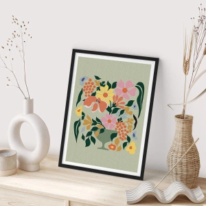 • Plakaten viser en farverig buket blomster i en dekorativ vase mod en grøn baggrund. En stilfuld og kunstnerisk komposition, perfekt til boheme- og retro-indretning. En sort ramme medfølger.