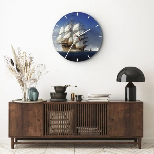 - Uret forestiller et massivt sejlskib, der sejler gennem et stormfuldt hav for fulde sejl. Scenen udstråler bevægelse, vindens kraft og en atmosfære af maritimt eventyr, hvilket bringer en følelse af rejse og klassisk elegance til interiøret.