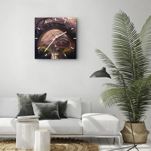 Vægur, Uret - Udsigt over den japanske kirsebærblomstbro gennem den runde port - 30x30cm - Japansk forår - Moderne vægdekoration til stue, køkken og soveværelse ARTTOR