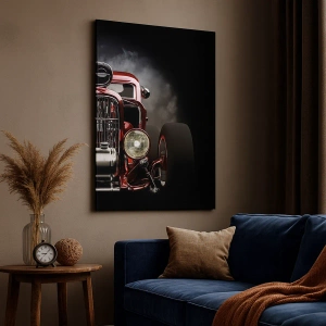 "Klassisk racerbil i rampelyset" er et maleri, der transporterer os til en verden af motorsport fuld af passion og dynamik. Kompositionens omdrejningspunkt er en rød klassisk racerbil, omgivet af den delikate glød fra forlygter på en mørk baggrund. Køretøjets detaljer, fra dens kromelementer til karosseriets elegante linjer, er blevet indfanget med ekstraordinær præcision og formidler både dens æstetik og kraft.