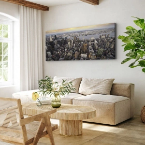 - Maleriet forestiller en panoramaudsigt over en moderne by ved solnedgang. Skyskrabere, rummelige gader og lysets spil understreger metropolens charme. Det er perfekt til at indrette et moderne interiør.