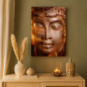 - Maleriet forestiller en Buddha-statue omgivet af gyldne flammer. Det er et ideelt motiv til interiør inspireret af Orienten og spirituel harmoni.