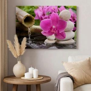 Orkidémotivet omgivet af vand og sten er et symbol på fred, skønhed og harmoni. Det er et ideelt valg for folk, der værdsætter naturlig skønhed og en afslappende atmosfære i deres omgivelser. Dette maleri kan også være en unik gave til elskere af naturen og zen-æstetik.
