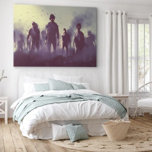 - Dette lærredstryk forestiller mystiske silhuetter med gule øjne, omgivet af tåge og en mørk atmosfære. Det er perfekt til elskere af gys og ukonventionelle interiører.