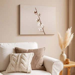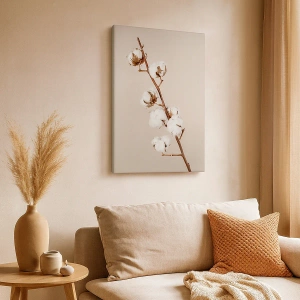 - Maleriet forestiller en delikat bomuldskvist mod en beige baggrund, hvilket skaber en subtil og harmonisk komposition. Perfekt til minimalistiske og elegante interiører.